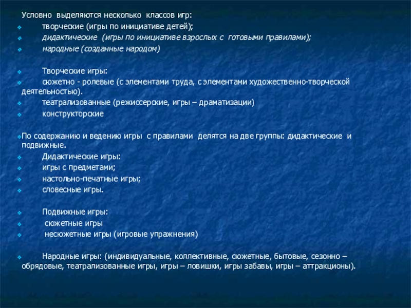 Народные игры: (индивидуальные, коллективные, сюжетные, бытовые, сезонно – обрядовые, театрализованные игры, игры – ловишки, игры забавы, игры – аттракционы).