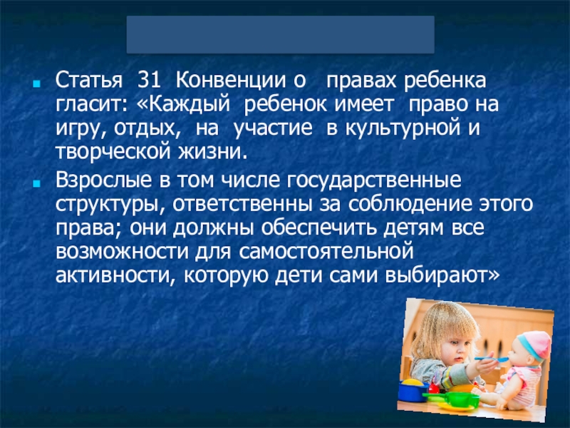 Взрослые в том числе государственные структуры, ответственны за соблюдение этого права; они должны обеспечить детям все возможности для самостоятельной активности, которую дети сами выбирают»