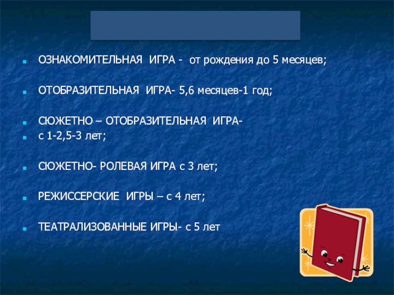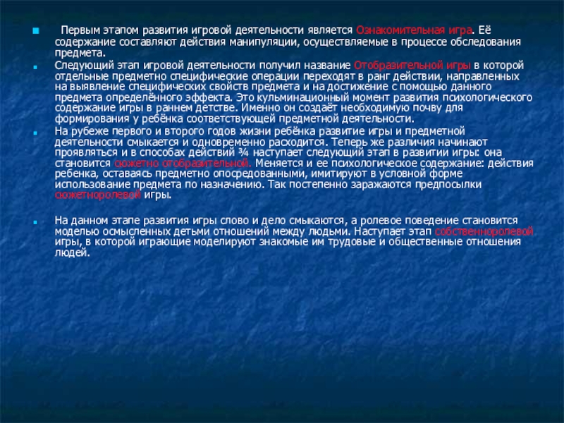Слайд 13 Первым этапом развития игровой деятельности является Ознакомительная игра. Её содержание