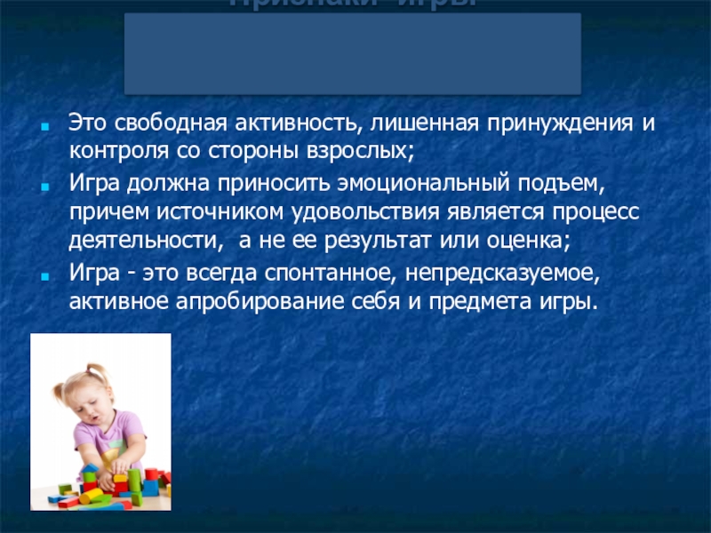 Игра должна приносить эмоциональный подъем, причем источником удовольствия является процесс деятельности, а не ее результат или оценка;