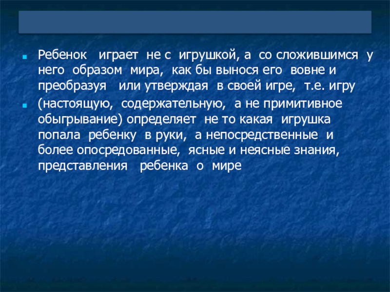 (настоящую, содержательную, а не примитивное обыгрывание) определяет не то какая игрушка попала ребенку в руки, а непосредственные и более опосредованные, ясные и неясные знания, представления ребенка о мире