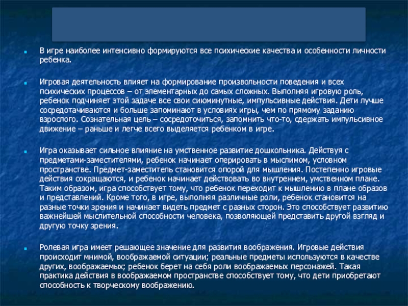 Игра оказывает сильное влияние на умственное развитие дошкольника. Действуя с предметами-заместителями, ребенок начинает оперировать в мыслимом, условном пространстве. Предмет-заместитель становится опорой для мышления. Постепенно игровые действия сокращаются, и ребенок начинает действовать во внутреннем, умственном плане. Таким образом, игра способствует тому, что ребенок переходит к мышлению в плане образов и представлений. Кроме того, в игре, выполняя различные роли, ребенок становится на разные точки зрения и начинает видеть предмет с разных сторон. Это способствует развитию важнейшей мыслительной способности человека, позволяющей представить другой взгляд и другую точку зрения.