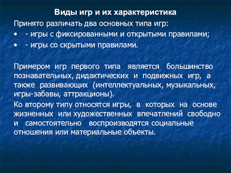 Примером игр первого типа является большинство познавательных, дидактических и подвижных игр, а также развивающих (интеллектуальных, музыкальных, игры-забавы, аттракционы).