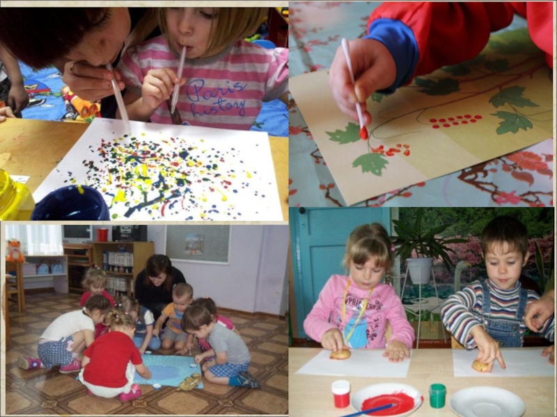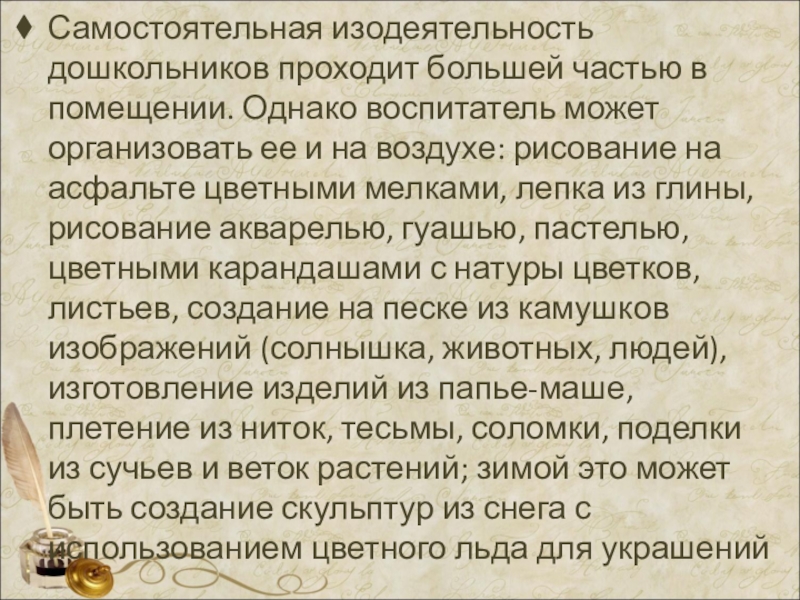 Слайд 10Самостоятельная изодеятельность дошкольников проходит большей частью в помещении. Однако воспитатель может