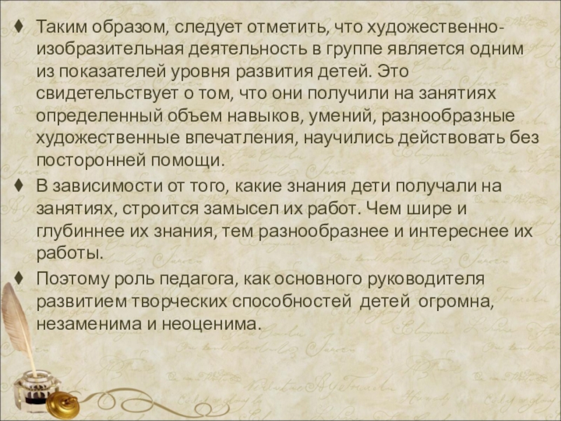 Поэтому роль педагога, как основного руководителя развитием творческих способностей детей огромна, незаменима и неоценима.