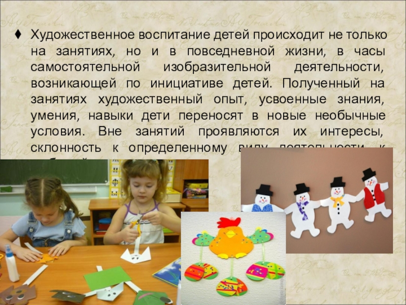 Слайд 7Художественное воспитание детей происходит не только на занятиях, но и в
