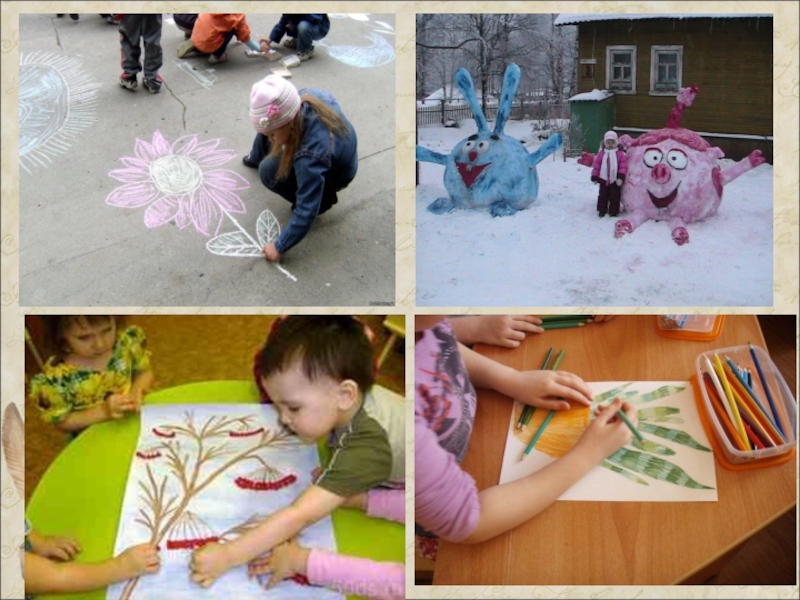 организовать ее и на воздухе: рисование на асфальте цветными мелками, лепка из глины, рисование акварелью, гуашью, пастелью, цветными карандашами с натуры цветков, листьев, создание на песке из камушков изображений (солнышка, животных, людей), изготовление изделий из папье-маше, плетение из ниток, тесьмы, соломки, поделки из сучьев и веток растений; зимой это может быть создание скульптур из снега с использованием цветного льда для украшений