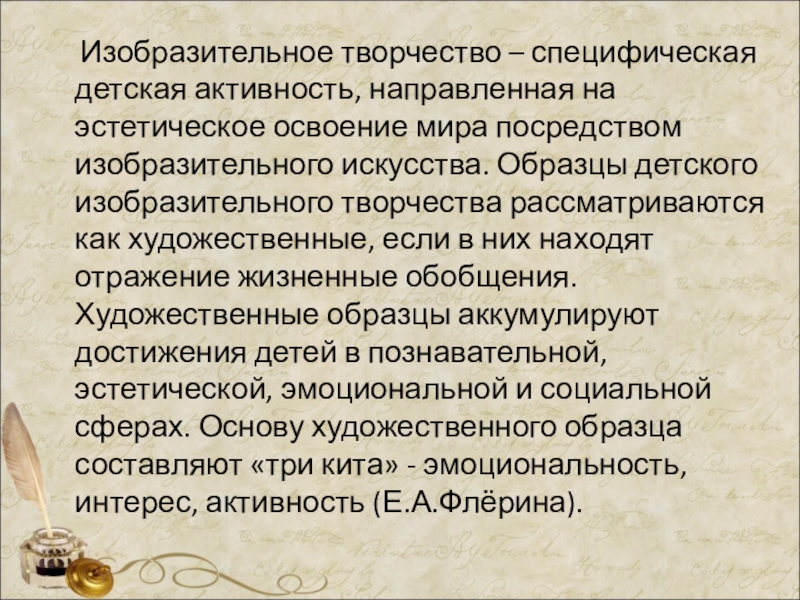 эстетическое освоение мира посредством изобразительного искусства. Образцы детского изобразительного творчества рассматриваются как художественные, если в них находят отражение жизненные обобщения. Художественные образцы аккумулируют достижения детей в познавательной, эстетической, эмоциональной и социальной сферах. Основу художественного образца составляют «три кита» - эмоциональность, интерес, активность (Е.А.Флёрина).