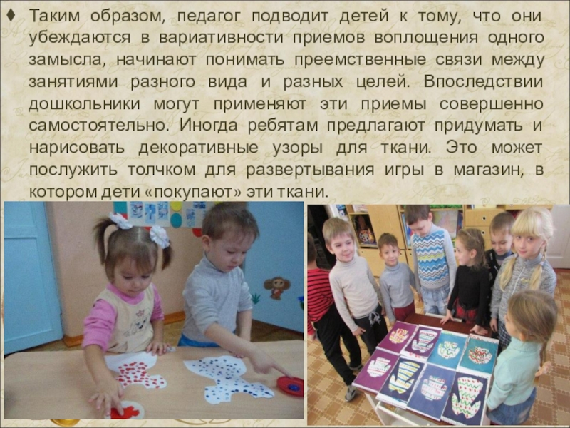 вариативности приемов воплощения одного замысла, начинают понимать преемственные связи между занятиями разного вида и разных целей. Впоследствии дошкольники могут применяют эти приемы совершенно самостоятельно. Иногда ребятам предлагают придумать и нарисовать декоративные узоры для ткани. Это может послужить толчком для развертывания игры в магазин, в котором дети «покупают» эти ткани.