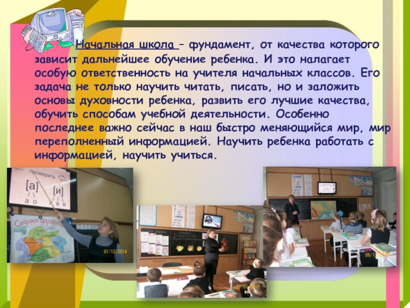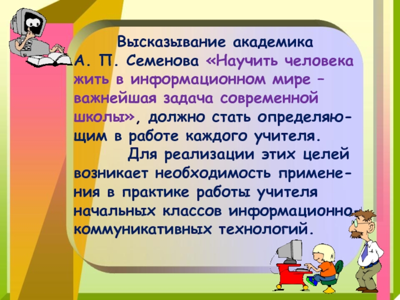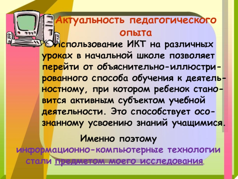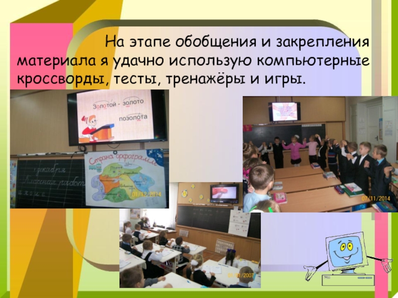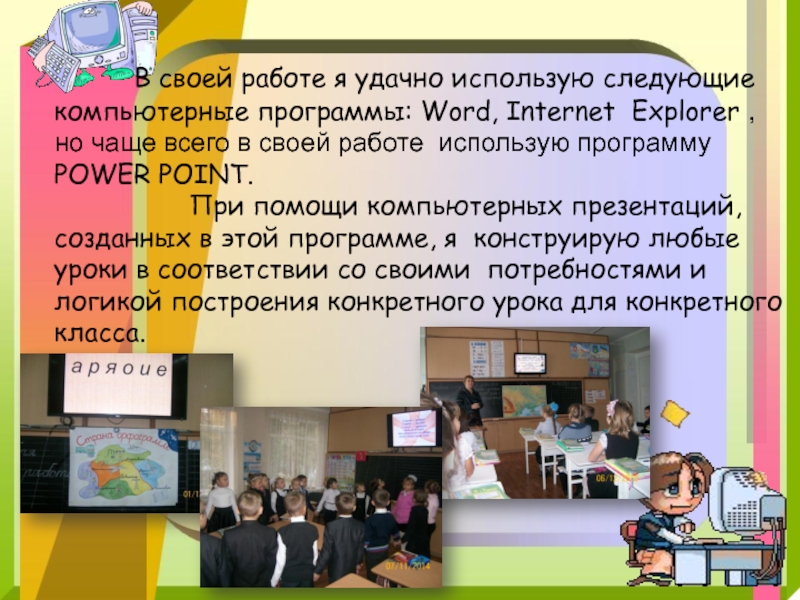 При помощи компьютерных презентаций, созданных в программе POWER POINT, я конструирую любые уроки в соответствии со своими потребностями и логикой построения конкретного урока для конкретного класса.