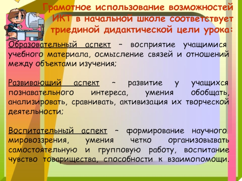 Развивающий аспект – развитие у учащихся познавательного интереса, умения обобщать, анализировать, сравнивать, активизация их творческой деятельности;