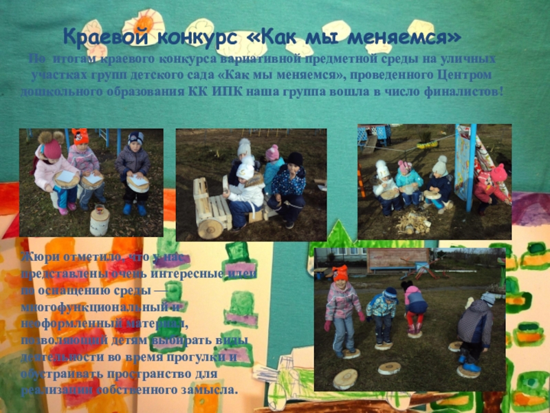Жюри отметило, что у нас представлены очень интересные идеи по оснащению среды — многофункциональный и неоформленный материал, позволяющий детям выбирать виды деятельности во время прогулки и обустраивать пространство для реализации собственного замысла.