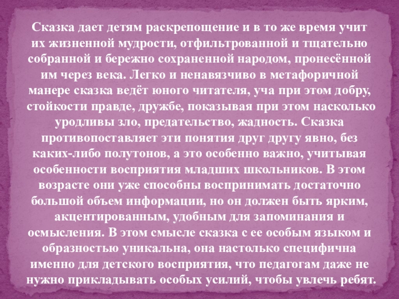 жизненной мудрости, отфильтрованной и тщательно собранной и бережно сохраненной народом, пронесённой им через века. Легко и ненавязчиво в метафоричной манере сказка ведёт юного читателя, уча при этом добру, стойкости правде, дружбе, показывая при этом насколько уродливы зло, предательство, жадность. Сказка противопоставляет эти понятия друг другу явно, без каких-либо полутонов, а это особенно важно, учитывая особенности восприятия младших школьников. В этом возрасте они уже способны воспринимать достаточно большой объем информации, но он должен быть ярким, акцентированным, удобным для запоминания и осмысления. В этом смысле сказка с ее особым языком и образностью уникальна, она настолько специфична именно для детского восприятия, что педагогам даже не нужно прикладывать особых усилий, чтобы увлечь ребят.