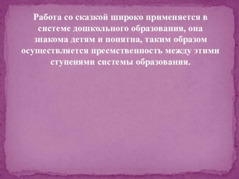 Слайд 10Работа со сказкой широко применяется в системе дошкольного образования, она знакома