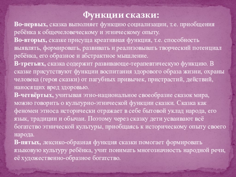 В-пятых, лексико-образная функция сказки помогает формировать языковую культуру ребёнка, учит понимать многозначность народной речи, её художественно-образное богатство.