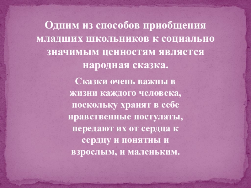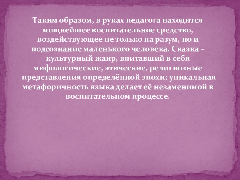 только на разум, но и подсознание маленького человека. Сказка – культурный жанр, впитавший в себя мифологические, этические, религиозные представления определённой эпохи; уникальная метафоричность языка делает её незаменимой в воспитательном процессе.