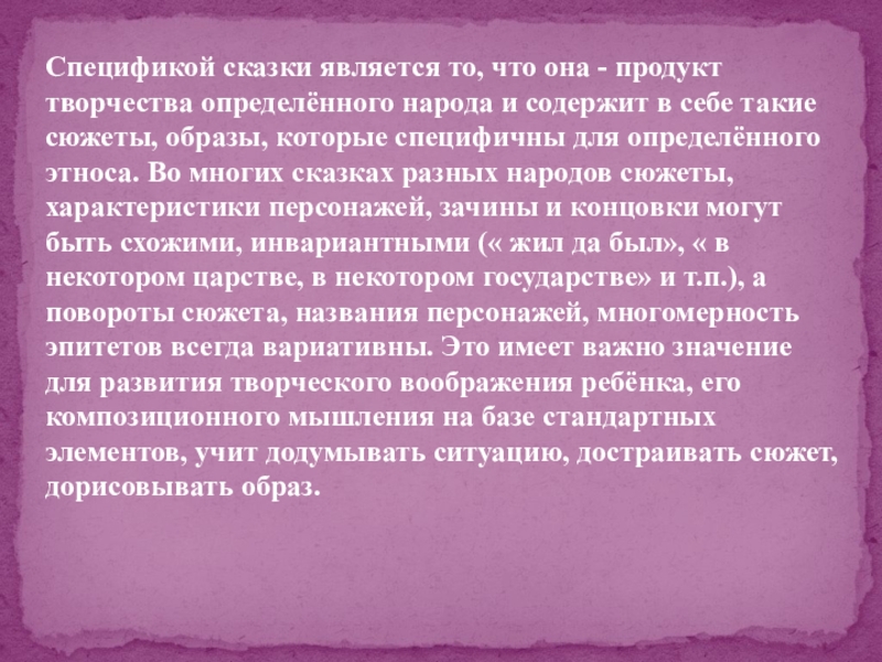 и содержит в себе такие сюжеты, образы, которые специфичны для определённого этноса. Во многих сказках разных народов сюжеты, характеристики персонажей, зачины и концовки могут быть схожими, инвариантными (« жил да был», « в некотором царстве, в некотором государстве» и т.п.), а повороты сюжета, названия персонажей, многомерность эпитетов всегда вариативны. Это имеет важно значение для развития творческого воображения ребёнка, его композиционного мышления на базе стандартных элементов, учит додумывать ситуацию, достраивать сюжет, дорисовывать образ.