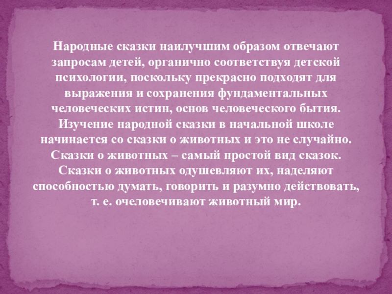 поскольку прекрасно подходят для выражения и сохранения фундаментальных человеческих истин, основ человеческого бытия. Изучение народной сказки в начальной школе начинается со сказки о животных и это не случайно. Сказки о животных – самый простой вид сказок. Сказки о животных одушевляют их, наделяют способностью думать, говорить и разумно действовать, т. е. очеловечивают животный мир.