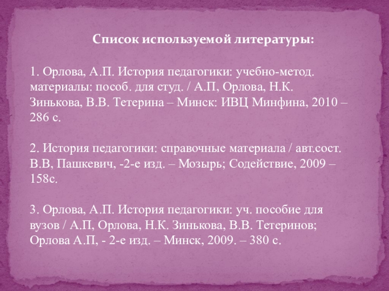 1. Орлова, А.П. История педагогики: учебно-метод.материалы: пособ. для студ.