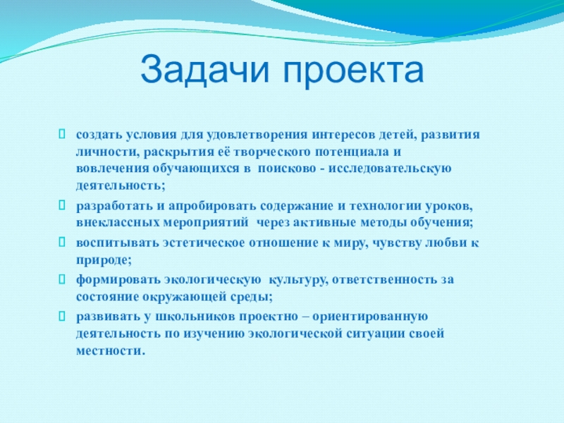 развивать у школьников проектно – ориентированную деятельность по изучению экологической ситуации своей местности.