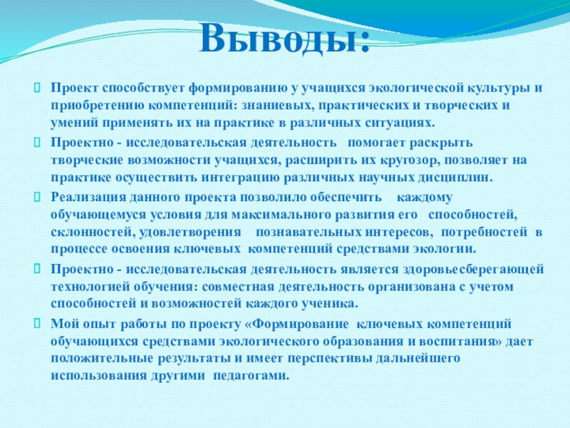 Реализация данного проекта позволило обеспечить каждому обучающемуся условия для максимального развития его способностей, склонностей, удовлетворения познавательных интересов, потребностей в процессе освоения ключевых компетенций средствами экологии.