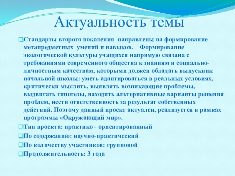 и навыков. Формирование экологической культуры учащихся напрямую связана с требованиями современного общества к знаниям и социально-личностным качествам, которыми должен обладать выпускник начальной школы: уметь адаптироваться в реальных условиях, критически мыслить, выявлять возникающие проблемы, выдвигать гипотезы, находить альтернативные варианты решения проблем, нести ответственность за результат собственных действий. Поэтому данный проект актуален, реализуется в рамках программы «Окружающий мир».