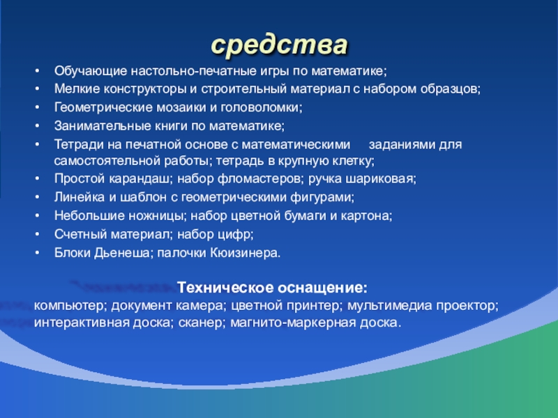 компьютер; документ камера; цветной принтер; мультимедиа проектор; интерактивная доска; сканер; магнито-маркерная доска.