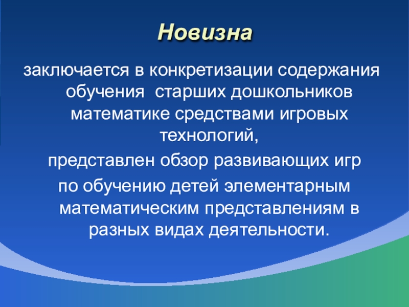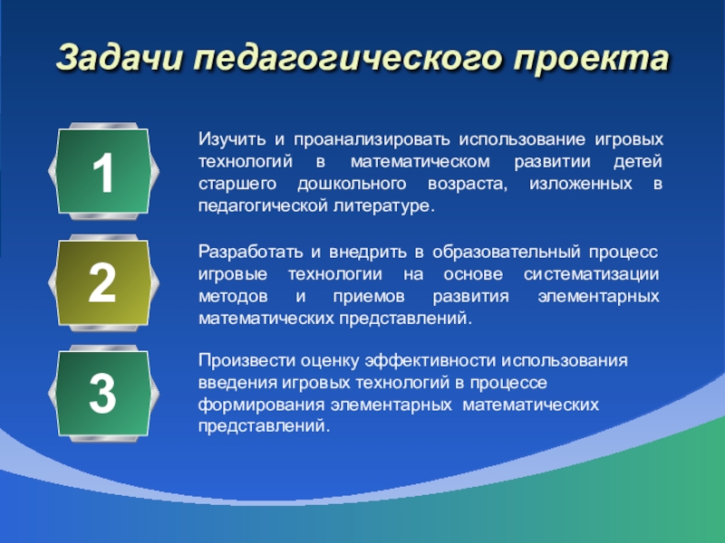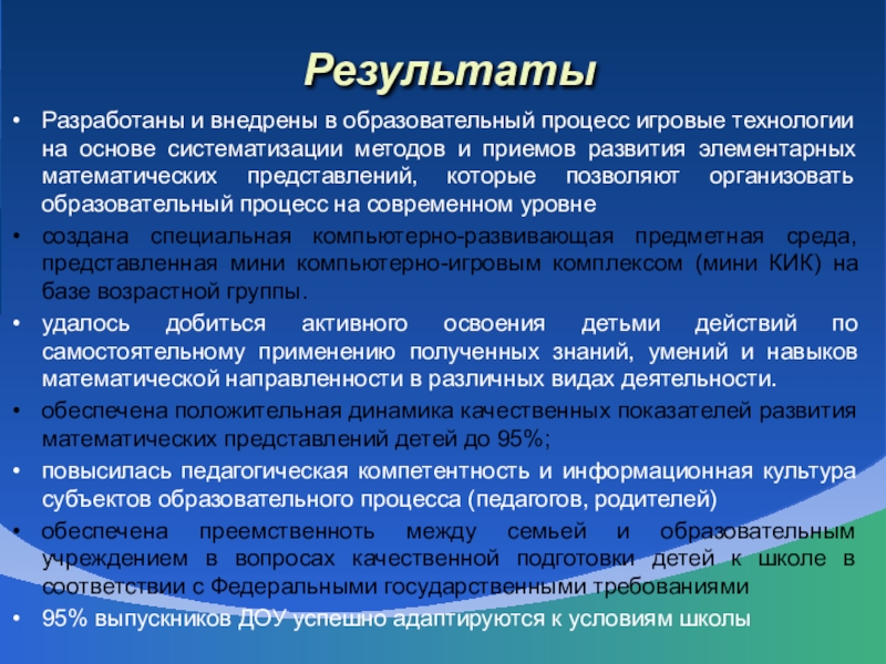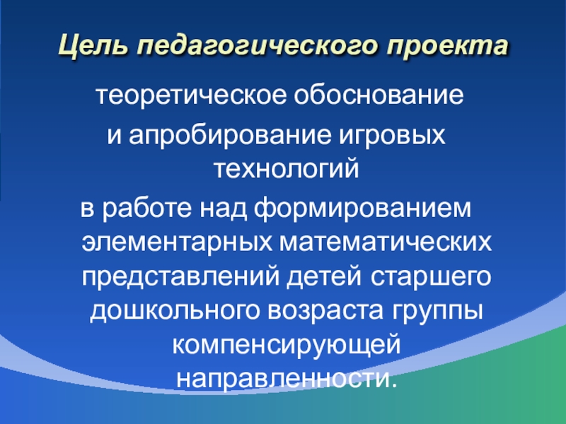 Разработать и внедрить в образовательный процесс игровые технологии на основе систематизации методов и приемов развития элементарных математических представлений.