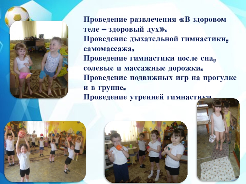 «Найди пару», «Пробеги тихо», «Накинь кольцо», «Краски», «Пятнашки», «Жмурки», «Третий лишний», «Болото», «Сматываем верёвочку».