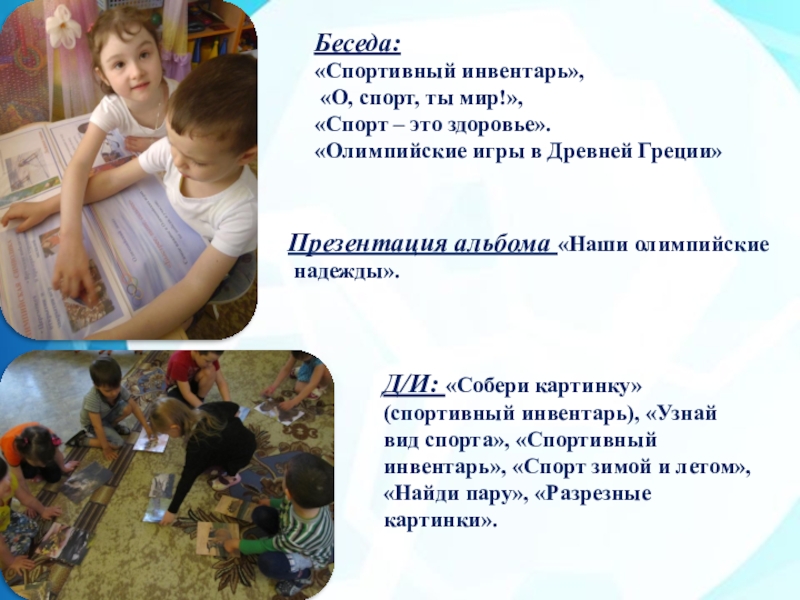 Д/И: «Собери картинку» (спортивный инвентарь), «Узнай вид спорта», «Спортивный инвентарь», «Спорт зимой и летом», «Найди пару», «Разрезные картинки».