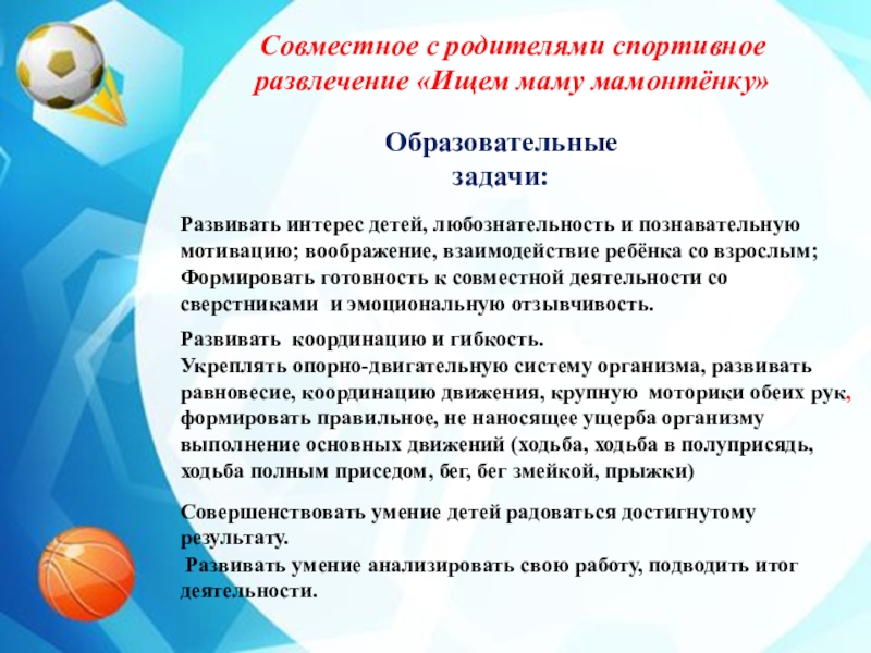 Укреплять опорно-двигательную систему организма, развивать равновесие, координацию движения, крупную моторики обеих рук, формировать правильное, не наносящее ущерба организму выполнение основных движений (ходьба, ходьба в полуприсядь, ходьба полным приседом, бег, бег змейкой, прыжки)