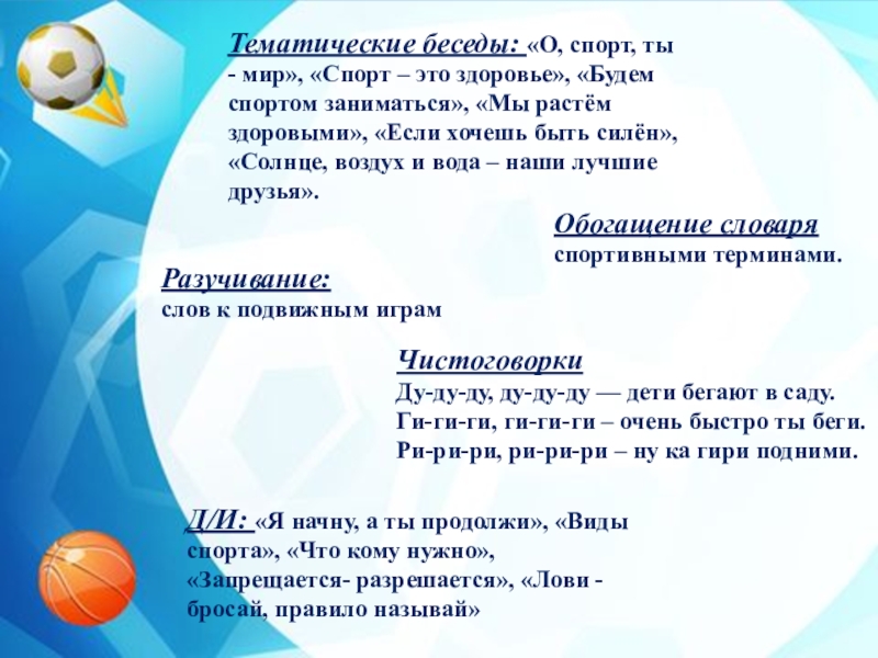 Д/И: «Я начну, а ты продолжи», «Виды спорта», «Что кому нужно», «Запрещается- разрешается», «Лови - бросай, правило называй»