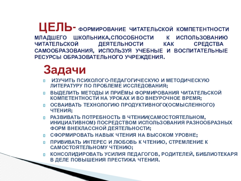КОНСОЛИДИРОВАТЬ УСИЛИЯ ПЕДАГОГОВ, РОДИТЕЛЕЙ, БИБЛИОТЕКАРЯ В ДЕЛЕ ПОВЫШЕНИЯ ПРЕСТИЖА ЧТЕНИЯ.