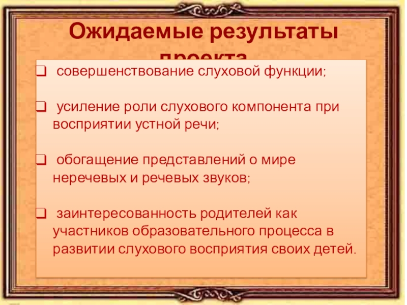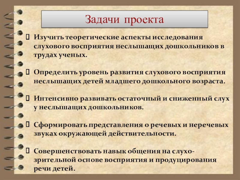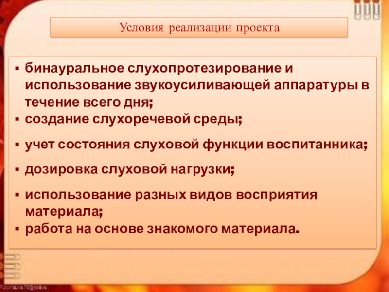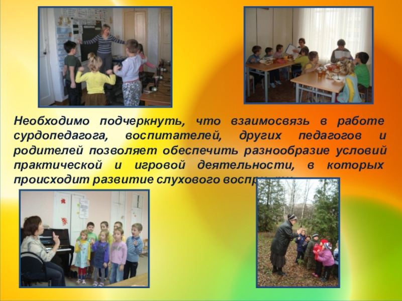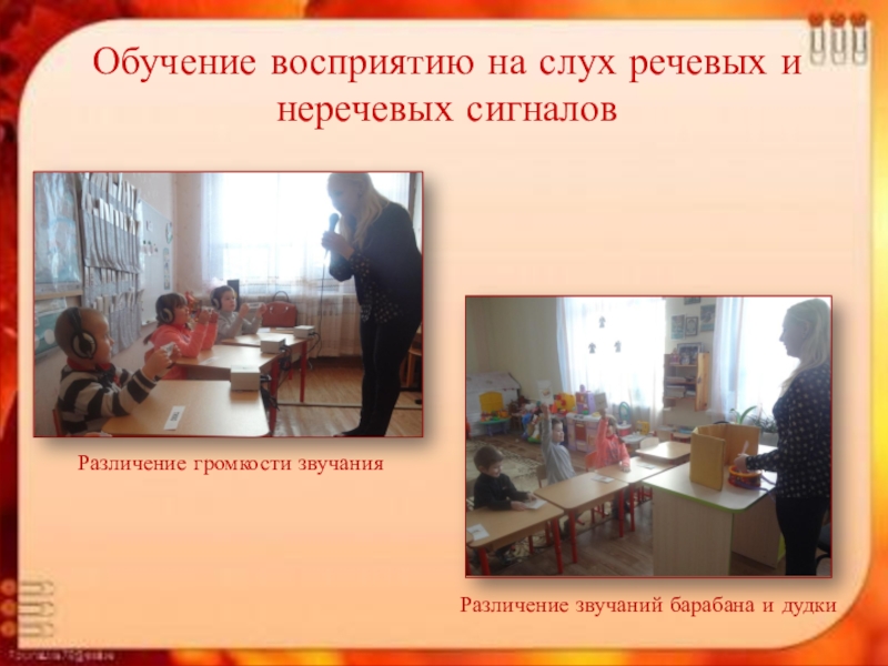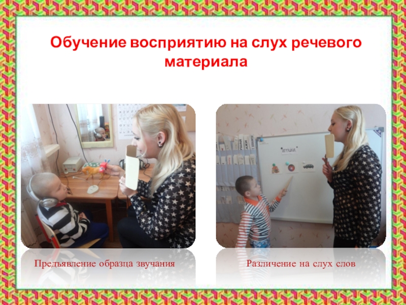 Создание условий для слухо-зрительного и слухового восприятия материала; обучение детей ощущению и различению на слух речевых и неречевых сигналов, восприятию звуков окружающего мира и устной речи не только во время занятий, но и при проведении режимных моментов, в играх, в свободной деятельности