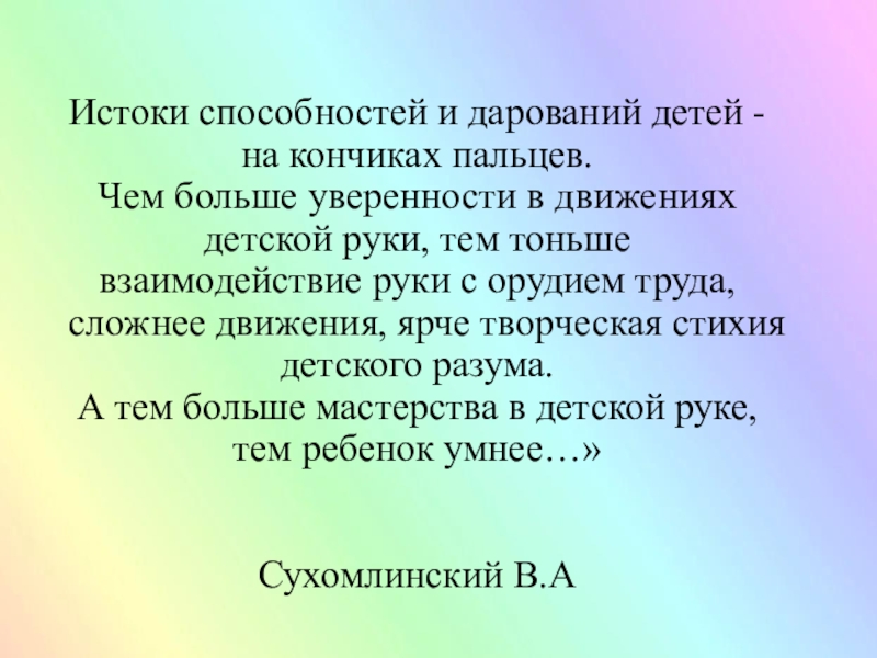 Слайд 2Истоки способностей и дарований детей - на кончиках пальцев.