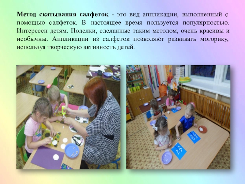 Слайд 14Метод скатывания салфеток - это вид аппликации, выполненный с помощью салфеток.
