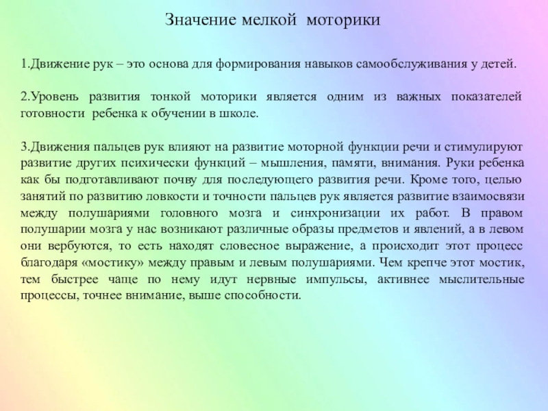 Слайд 6Значение мелкой моторики