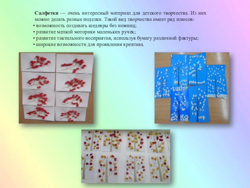 Слайд 13Салфетки — очень интересный материал для детского творчества. Из них можно