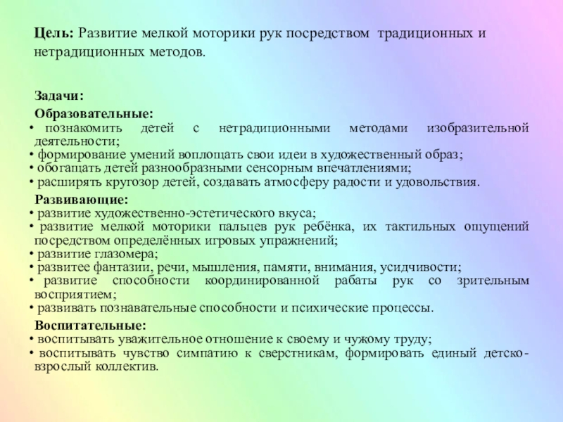 Слайд 4Цель: Развитие мелкой моторики рук посредством традиционных и нетрадиционных методов.