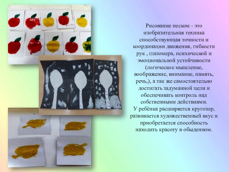 Слайд 10Рисование песком - это изобразительная техника способствующая точности и координации движения,