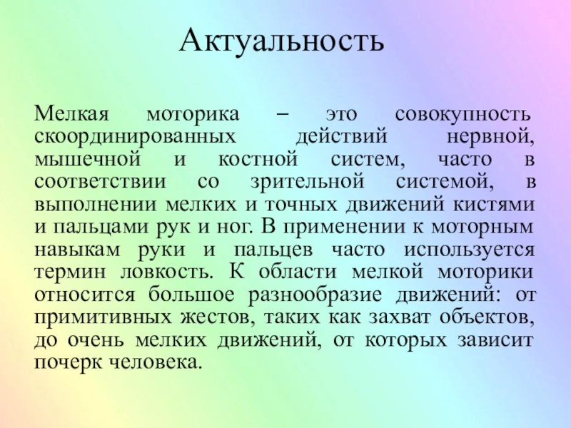 систем, часто в соответствии со зрительной системой, в выполнении мелких и точных движений кистями и пальцами рук и ног. В применении к моторным навыкам руки и пальцев часто используется термин ловкость. К области мелкой моторики относится большое разнообразие движений: от примитивных жестов, таких как захват объектов, до очень мелких движений, от которых зависит почерк человека.