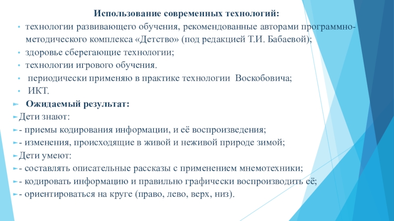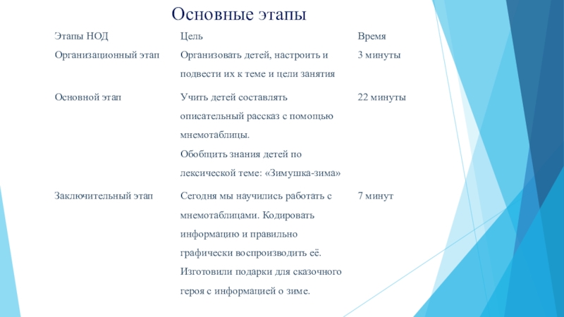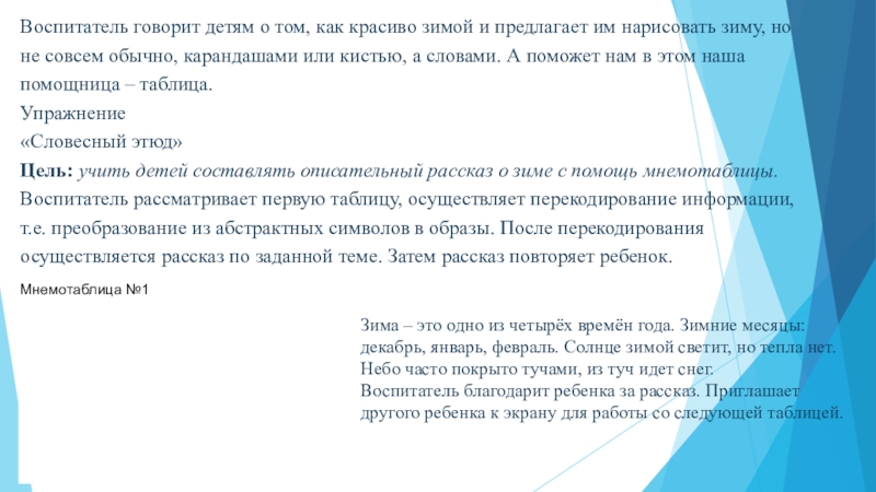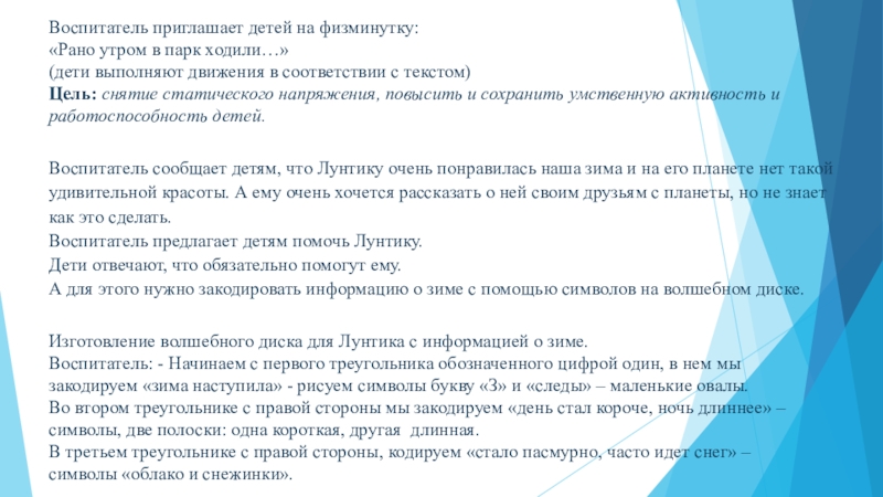 Воспитатель: - Начинаем с первого треугольника обозначенного цифрой один, в нем мы закодируем «зима наступила» - рисуем символы букву «З» и «следы» – маленькие овалы.