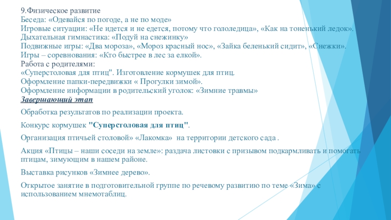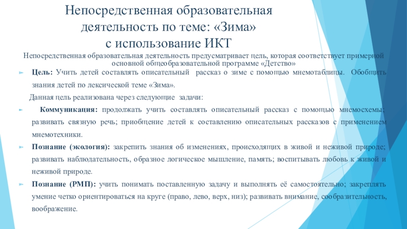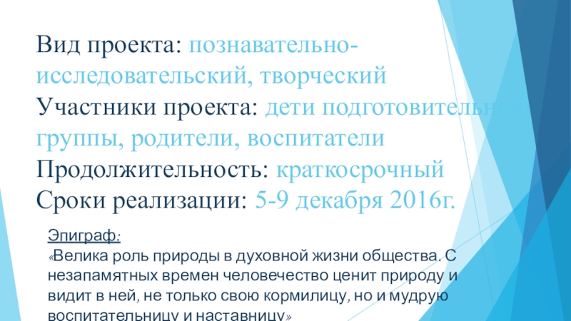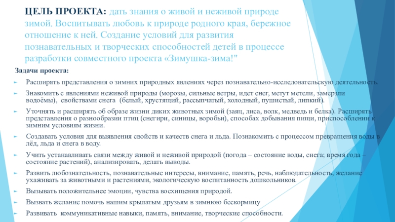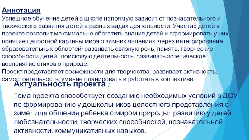 Тема проекта способствует созданию необходимых условий в ДОУ по формированию у дошкольников целостного представления о зиме; для общения ребенка с миром природы; развитию у детей любознательности, творческих способностей, познавательной активности, коммуникативных навыков.