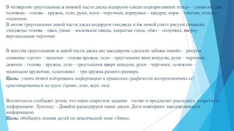 В шестом треугольнике в левой части диска мы закодируем «детские забавы зимой» – рисуем символы: «дети» – мальчик – голова кружок, тело – треугольник вниз конусом, руки – черточки, девочка – голова – кружок, тело – треугольник вверх конусом, руки – черточки, «снежки» – маленькие кружочки, «снеговик» – три кружка разного размера.