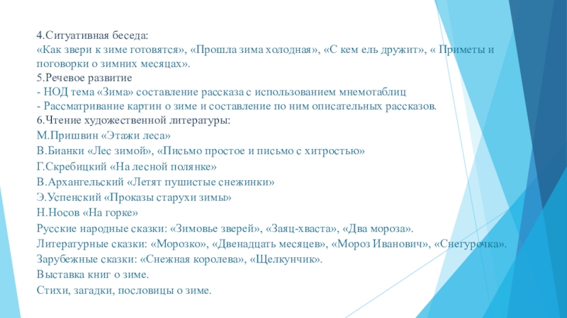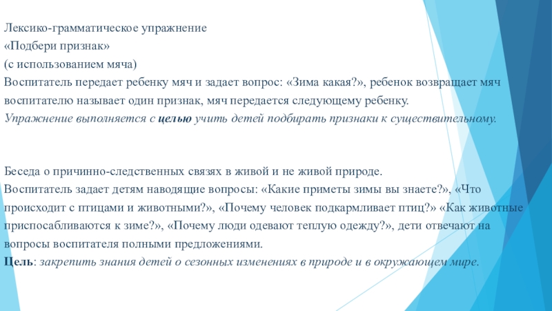 Знакомить с явлениями неживой природы (морозы, сильные ветры, идет снег, метут метели, замерзли водоёмы), свойствами снега (белый, хрустящий, рассыпчатый, холодный, пушистый, липкий).