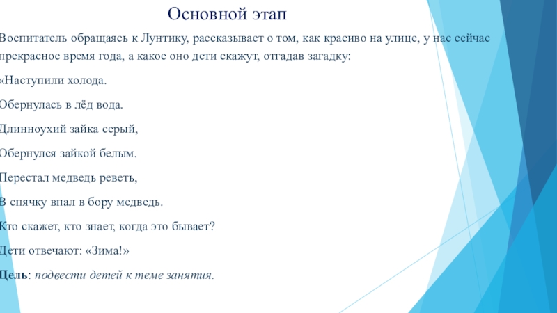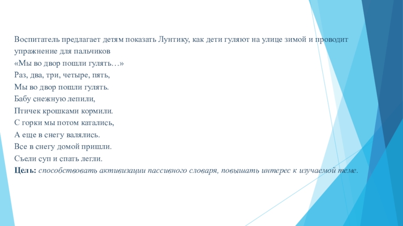 Воспитатель сообщает детям, что Лунтику очень понравилась наша зима и на его планете нет такой удивительной красоты. А ему очень хочется рассказать о ней своим друзьям с планеты, но не знает как это сделать.