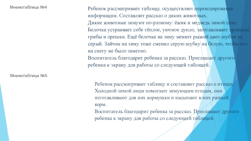 Ребенок рассматривает таблицу, осуществляет перекодирование информации, т.е. преобразование из абстрактных символов в образы. Составляет рассказ, используя в речи полные предложения.