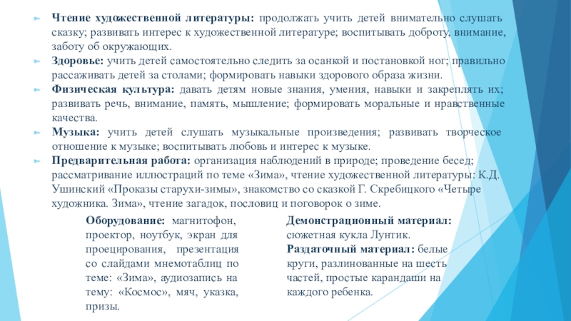 Оборудование: магнитофон, проектор, ноутбук, экран для проецирования, презентация со слайдами мнемотаблиц по теме: «Зима», аудиозапись на тему: «Космос», мяч, указка, призы.