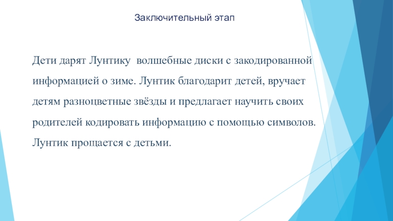 Воспитатель сообщает детям, что наше секретное задание готово и предлагает рассказать секретную информацию Лунтику: - Давайте раскодируем наши диски. Дети повторяют закодированную информацию.