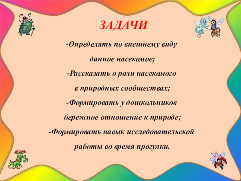 направлен на то, чтобы наши дети научились любить и беречь окружающий мир. И начать эту работу необходимо с самых маленьких обитателей нашей природы-насекомых. Они привлекательны и удивительны, они мало заметны из-за своих крошечных размеров и разнообразны, наши знания о них, к сожалению, очень и очень скудны, но их влияние на нашу жизнь огромно. Остановитесь, оглянитесь вокруг. Любое насекомое ,независимо от его размеров и роли в природе, при внимательном изучении оказывается бесконечно интересным и занимательным.